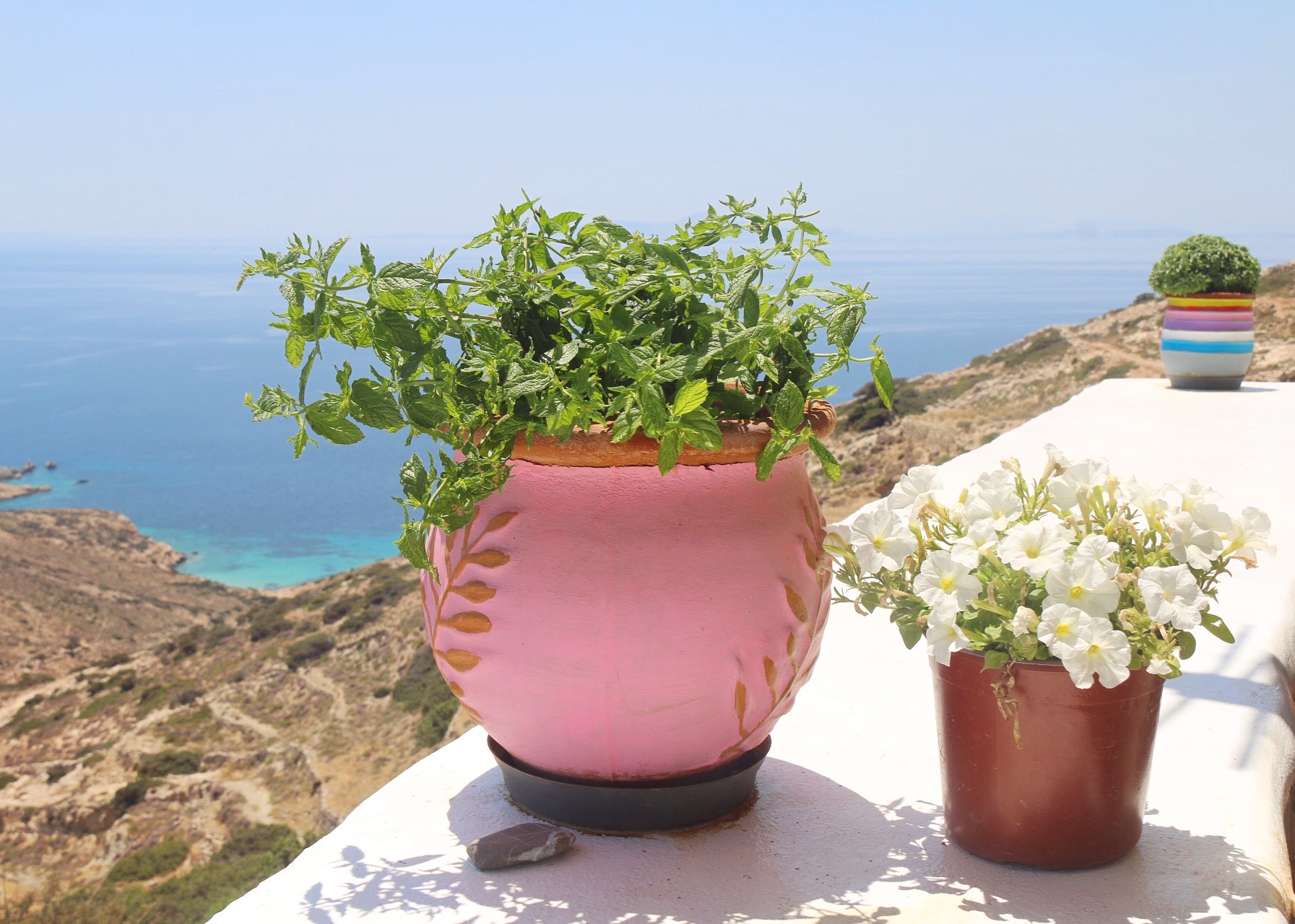 Örtkryddor och blommor i krukor på restauran Tzi Tzi på Donousa