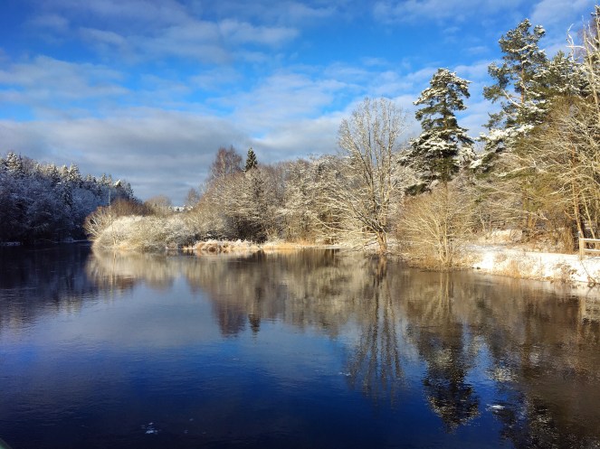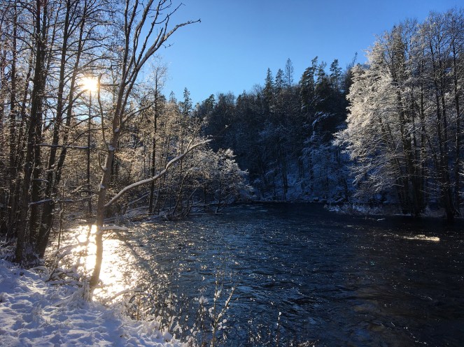 Någon strömstare såg vi nu inte den här gången. Men väl andra fåglar. Tyvärr på håll så bilderna blev inte bra. Men naturen var väldigt vacker den här dagen, med snö på marken och på träden, blå himmel och blått vatten. Och naturens egna isskulpturer i Mörrumsån.