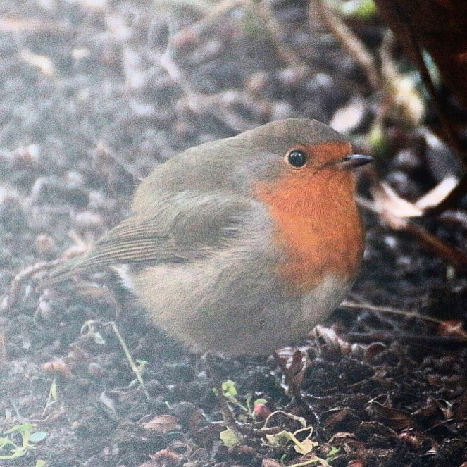 Den här rödhaken hoppar omkring här utanför ibland. Idag fotograferade jag den genom fönstret. Därav det märkliga diset i bilden som i själva verket är en reflex i fönstret.