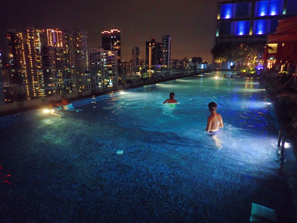Vi hinner med ett snabbt dopp i takpoolen innan den stänger klockan elva på kvällen. Åh! Denna underbara tropiska värme som gör att man vill bada även sena kvällar mitt i en storstad. Och från den här takpoolen ser vi den kända Marina Bay Sands med sina tre skyskrapor och en takvåning som sträcker sig över alla tre, och som ser ut som en gigantisk surfingbräda. Det var ju där som vi inledde vår resa en annan sen kväll, knappt 14 dagar tidigare, i deras mer kända takpool.