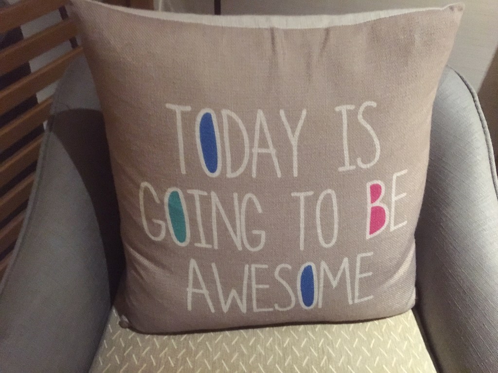 Rummet är sedan rent och fräscht och ser i det mesta ut som hotellrum brukar göra. Jag fotograferar en kudde i en fåtölj som har ett extra glatt budskap.