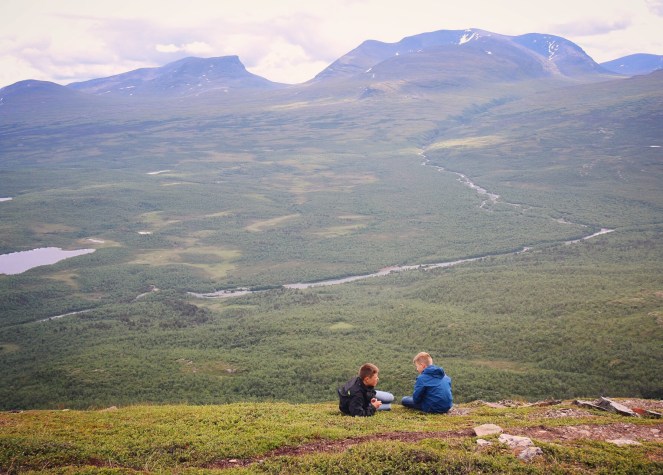 Vår första eftermiddag i Abisko nationalpark vandrar vi slinga nummer 3 till den lilla fjällsjön Njakajaure och tillbaka. Den är ungefär fem kilometer och ska ta ungefär två timmar. Men vi tar närmare tre timmar på oss. Trots att molnen ligger tunga över Lapporten, som därmed är dold just den här dagen, är vyerna fantastiska. Jag stannar ofta för att fotografera. Men strax innan vi nått slingans bortersta punkt vill inte han som där och då är 11-åringen längre. ”Vi skulle ju inte fjällvandra!”