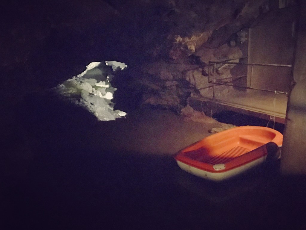 I turist-grottans sista rum ligger ett par plastbåtar helt stilla på en vattenspegel.