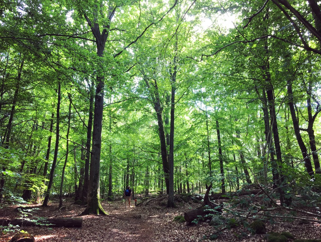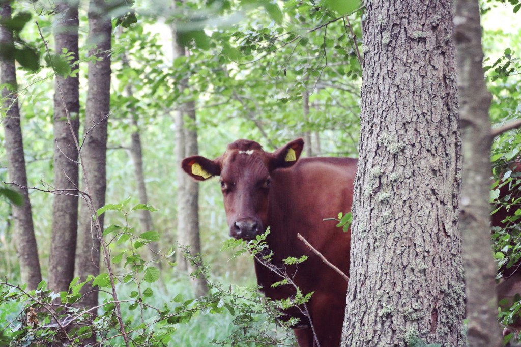 Vandringen börjar med att vi tar oss över ett staket via den trätrappa som finns där leden startar. I början är det mycket lövskog. Många olika sorters lövträd. Al, ek och bok. Bland annat. Kor betar bland träden. Sedan övergår skogen i ren bokskog. Leden går längs med en stig i skogen.