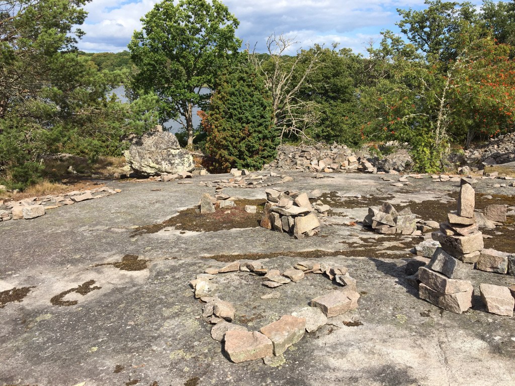 Överallt längs kusten i Blekinge stöter du på gamla stenbrott. Ofta är det gatsten som en gång har brutits. Så också här. Ser det ut som i alla fall. Vandrare som har passerat här före oss har roat sig med att göra formationer av stenarna. Torn, små högar och utlagt på hällarna stenar placerade så att de bildar virvlande spiraler. Och så ett hjärta av sten.