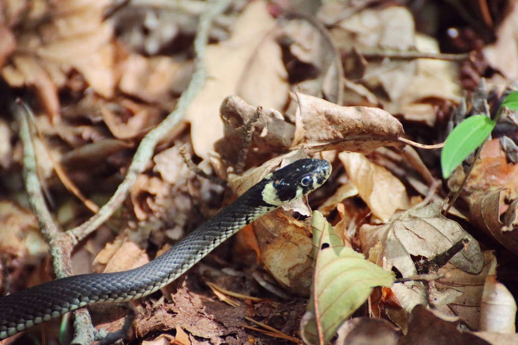 Plötsligt hyschar Anders mig och pekar på marken, på några vissna boklöv och vissnande blad av liljekonvalj. Där ligger en snok alldeles stilla. Gula prickar bakom huvudet.