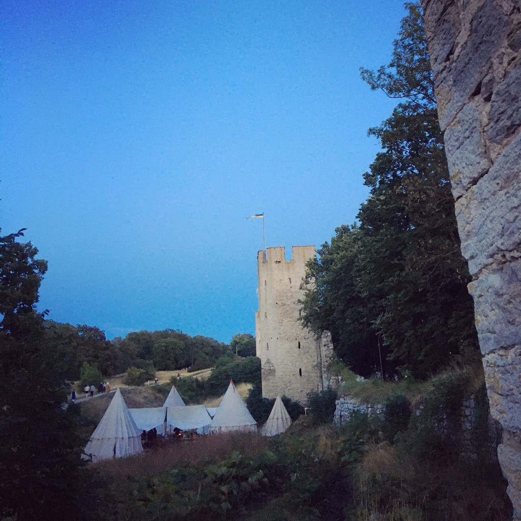 Efter Lummelunda blir det kväll i Visby med enklare mat. Anton och jag delar på en pizza och en tallrik sötpotatispommes. I Visby märks det annars tydligt att medeltidsveckan nu har börjat. Utklädda människor överallt och medeltida läger både utanför och innanför murarna.