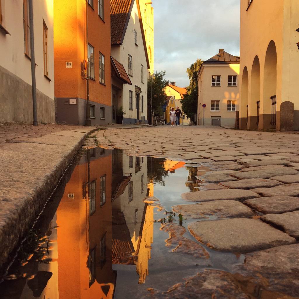 Glömde: Fastnar för en soliga speglingspölbilden från Visby, ett extra plus för paret i bakgrunden och att pölen är böjd. Snyggt!