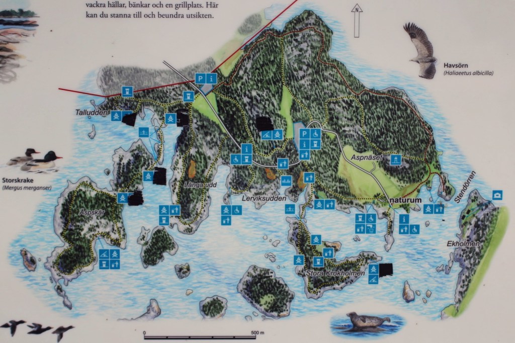 Vid naturum tar vi en fika från en food truck på platsen och sedan vandrar vi ut till och runt på Stora Krokholmen. En av de öar i området som du kommer till via en hängbro för gående. Det är väldigt trevligt ordnat, men det blir lite väntetid varje gång vi ska gå över en bro.