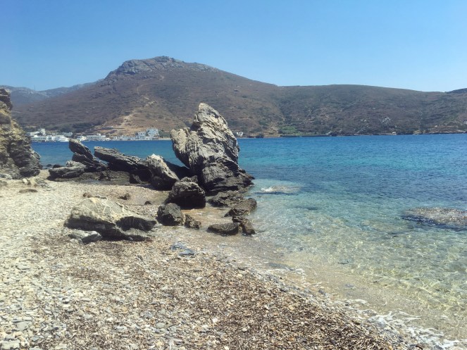 Vinjettbilden överst i inlägget: Stenformationer i vattenbrynet vid huvudorten Katapola på Amorgos.