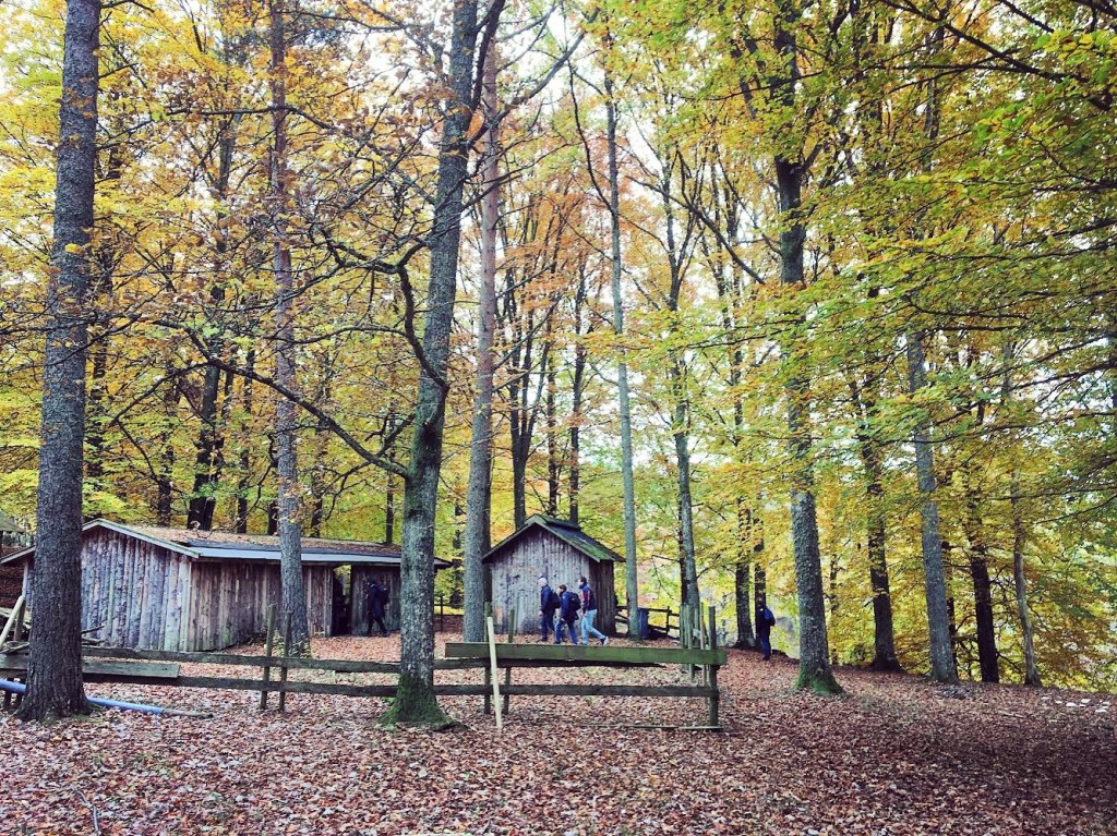 Nästa gång vi stannar är det vid en liten öppen grillplats. Här gör vi upp eld för att grilla medhavd korv. Här ansluter också de tre personer som inte var med från start på vår vandring. Nu tittar solen fram mellan boklöven och glittrar i ån. När korven är uppäten grillar vi marshmallows. Mums!