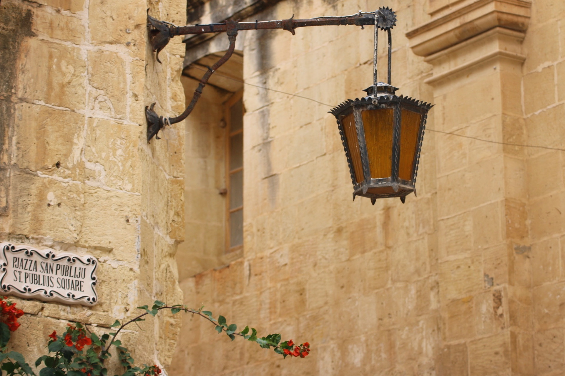 Vackra detaljer finns det gott om som här en lampa, en gatuskylt och en bougainvillea i Mdina.