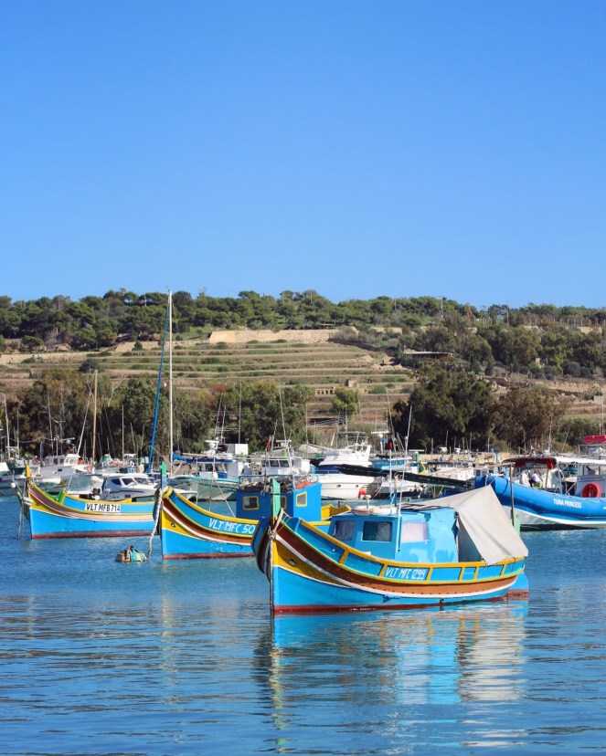 Traditionella färgglada fiskebåtar i Marsaxlokk på Malta framför terrassodlingar.