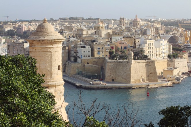 Utsikt från Valletta mot kringliggande tätbebyggelse och havsvikar.