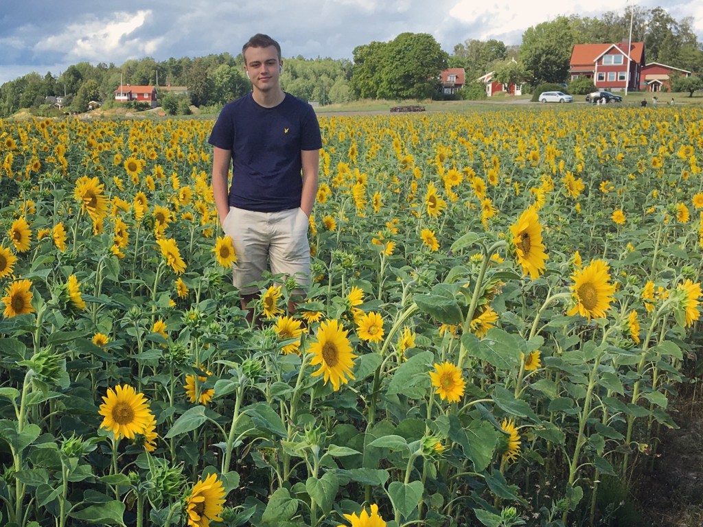 Anton i ett solrosfält i Spångbro.