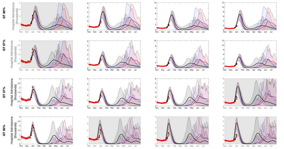 De brittiska forskarna har simulerat när en andra våg av omikron kan tänkas komma utifrån olika förutsättningar som variantens allvarlighetsgrad och generationstid i förhållande till tidigare varianter. Kurvor som följer hur det faktiskt hade sett ut fram till rapporten togs fram har markerats med vit bakgrund medan kurvor som inte följt den verkliga utvecklingen har markerats med grå bakgrund.