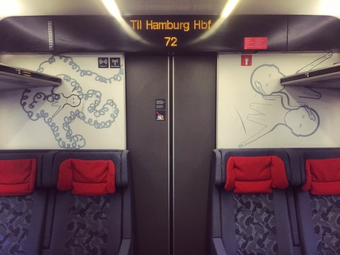 Trevligt tåginlägg. Det var så länge sen jag åkte tåg, senast utomlands från Madrid till Sevilla och sen bara till Stockholm någon gång. Men förr var det just sovtåg som gällde. Gillar din första bild med det slimmade röda tåget och det kupolformade taket och den från stationen i Hamburg. Sen undrar jag vad det är för konstiga väggmålningar på det danska tåget till H?