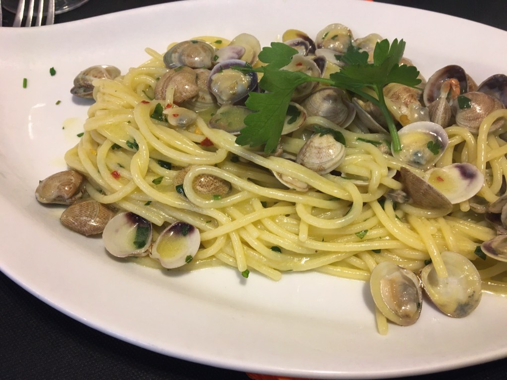 Lunch äter vi inomhus på en liten restaurang nära vårt hotell. Idag är det jag som tar en spaghetti vongole. Den är kryddad med rejält med vitlök.