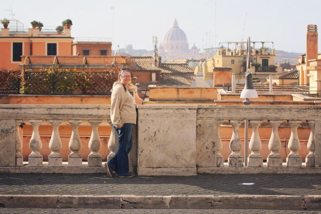 Vi kommer förbi många caféer, trattorior, kyrkor, parker och statyer. Jag ser en hel del blommor inne på olika trädgårdar. Bland annat en blommande magnolia. Till slut hamnar vi på ett stort torg. Här finns en obelisk i vad som på håll ser ut att vara en fontän. Och så någon slags officiell byggnad som vaktas av någon slags högvakt med munskydd. Men mest faller vi för utsikten över Roms takåsar och Peterskyrkan i bakgrunden.