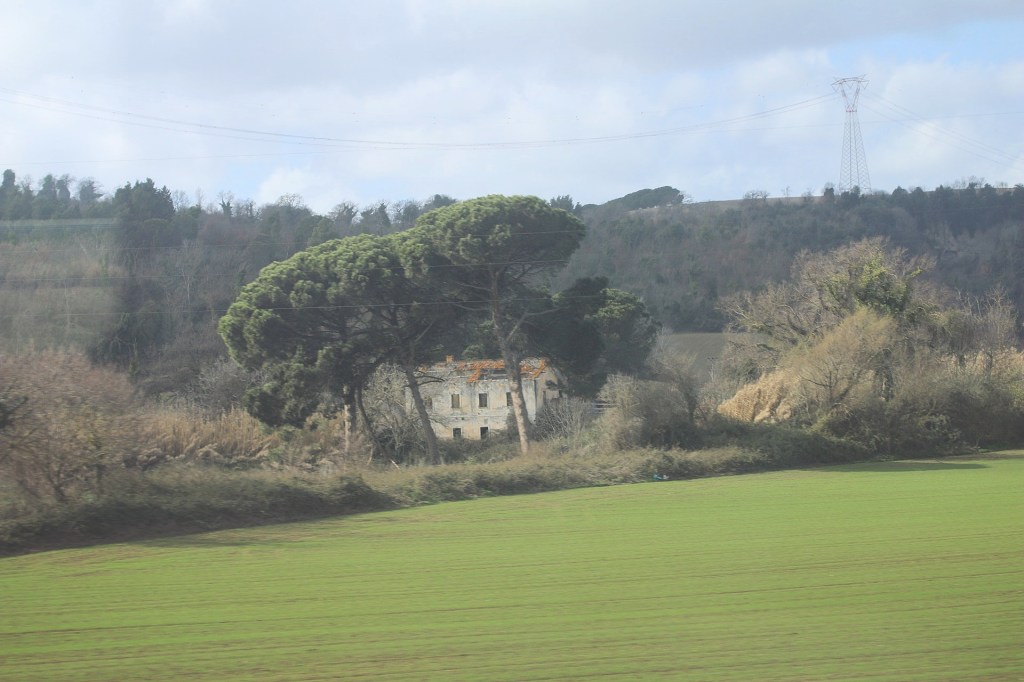 De italienska landskapen är som italienska landskap är. Det är berg och slätter. Pinjeträd och lövfällande dito. Gamla vackra hus på landet och ruffiga förstäder närmast järnvägen. Tyvärr går snabbtåget även denna gången väldigt mycket genom tunnlar så vi får nöja oss med de glimtar vi får av landskapet.