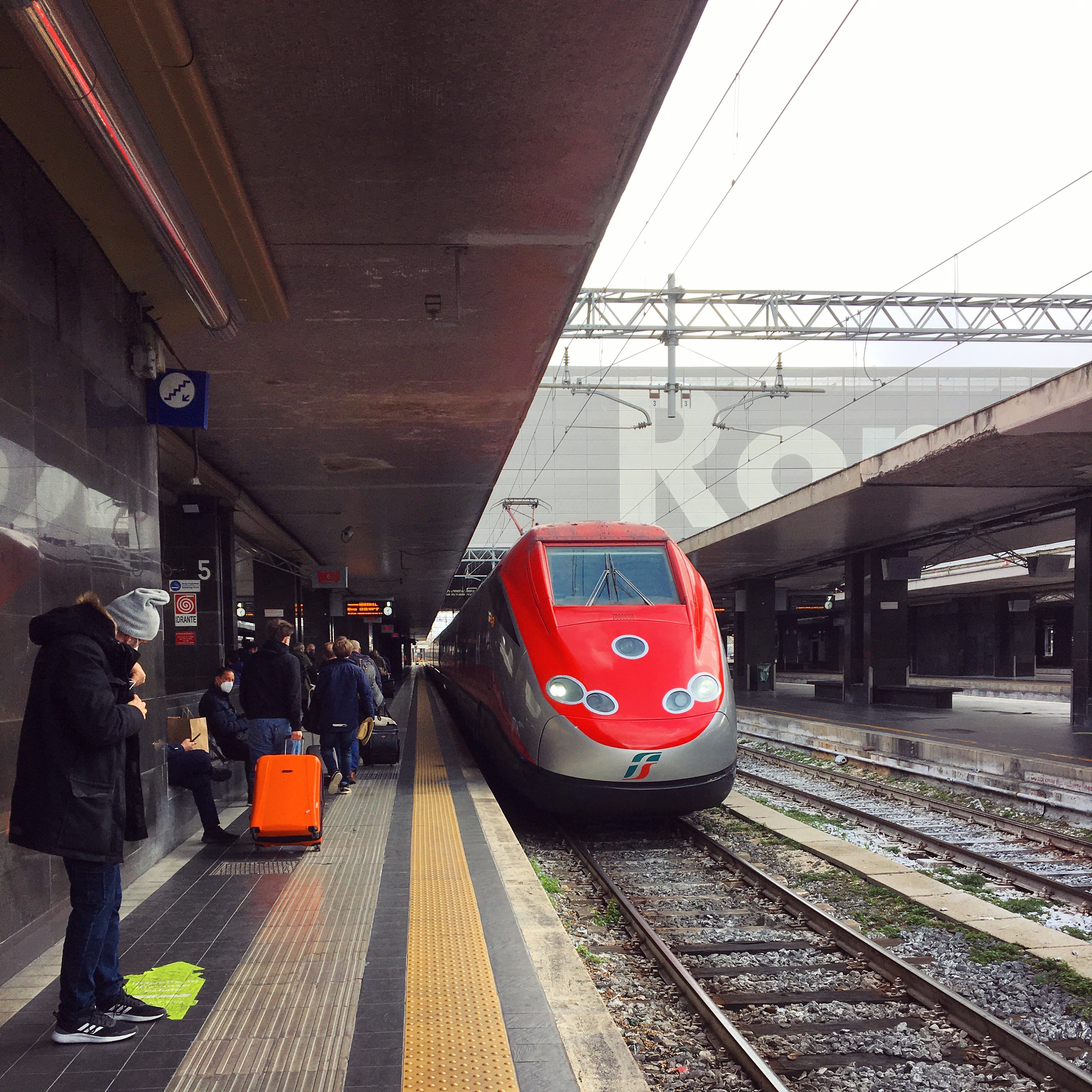 Redan från Rom-Fiumicinos flygplats (Leonardo da Vinci International Airport) tar vi tåget in till Roma Termini. Roms centralstation. Biljetter köper vi i en biljettautomat. Sedan blir det efterhand mycket bråttom eftersom det visar sig vara betydligt längre mellan biljettautomaten och själva järnvägsstationen på flygplatsen än vi kunnat ana.