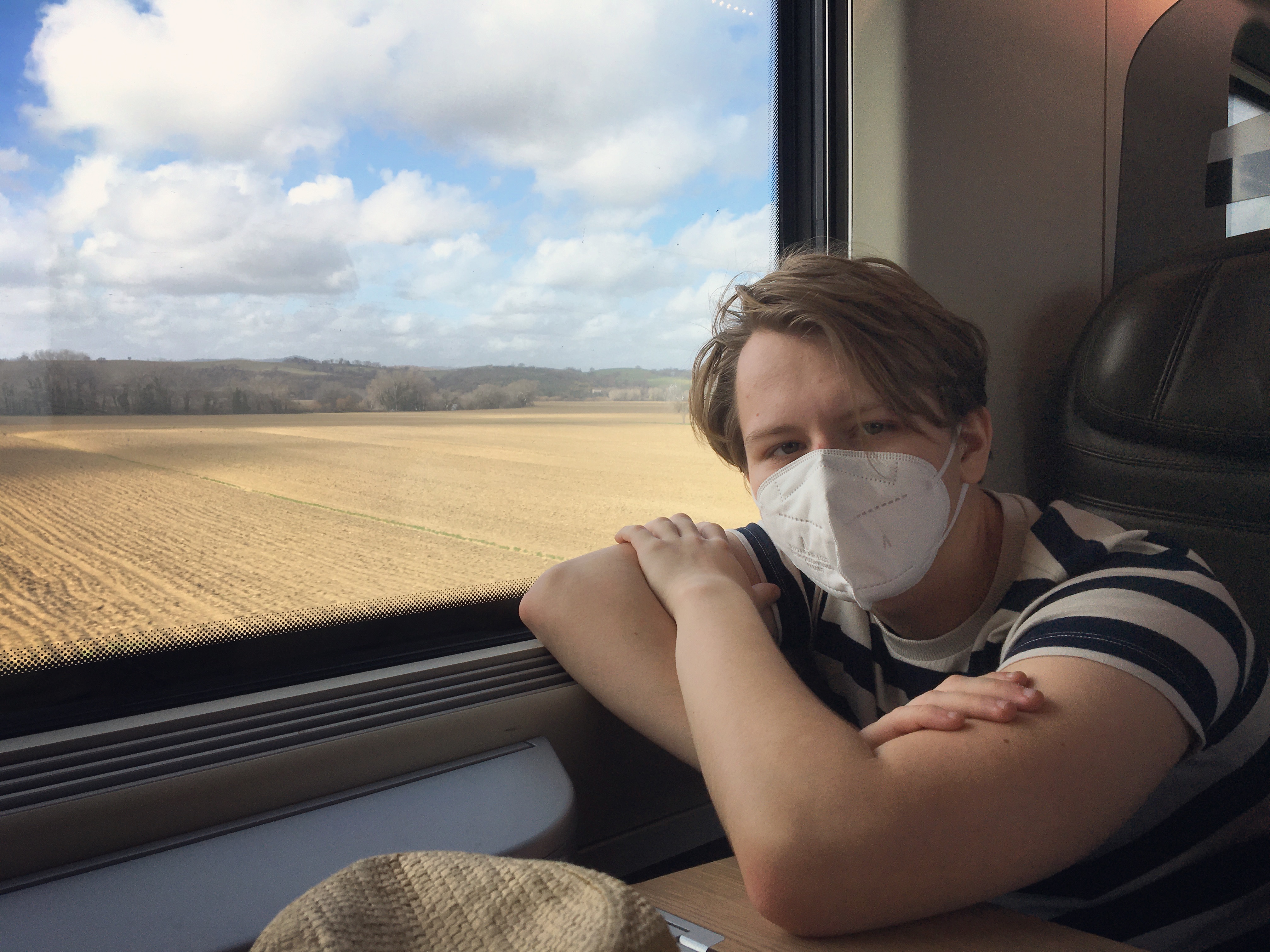 Klockan 13:40 avgår så vårt snabbtåg, fem minuter försenat. Konduktören kollar både våra biljetter och covid-pass.