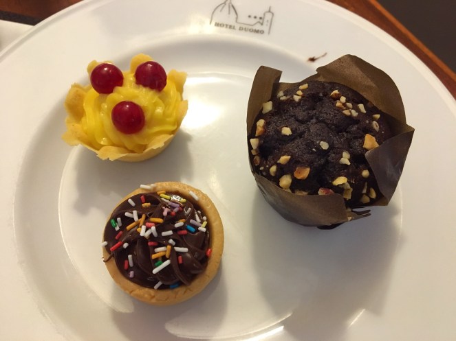 De utlovade ”guld-förmånerna” uteblir helt. Men det är ändå småsaker. Det här är ett trestjärnigt hotell och vi betalar en tusenlapp per dubbelrum och natt i februari 2022. Då ingår frukostbuffén i priset. Och utifrån det är både läget och utsikten mot Florens största katedral helt fantastiska.