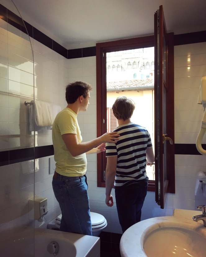 Grabbarna kollar in utsikten från badrummet.