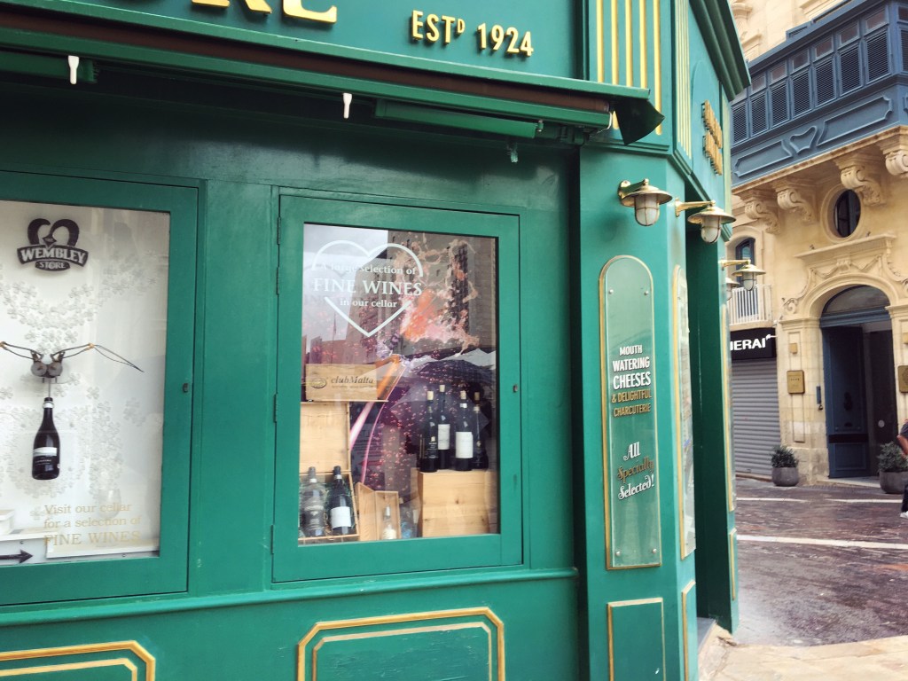 Pub i närapå engelsk stil i Valletta. Dock med vinflaskor i fönstren.