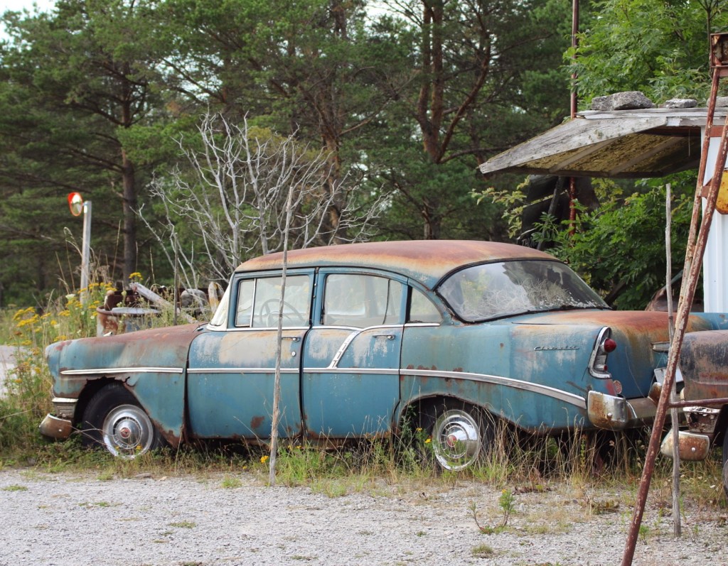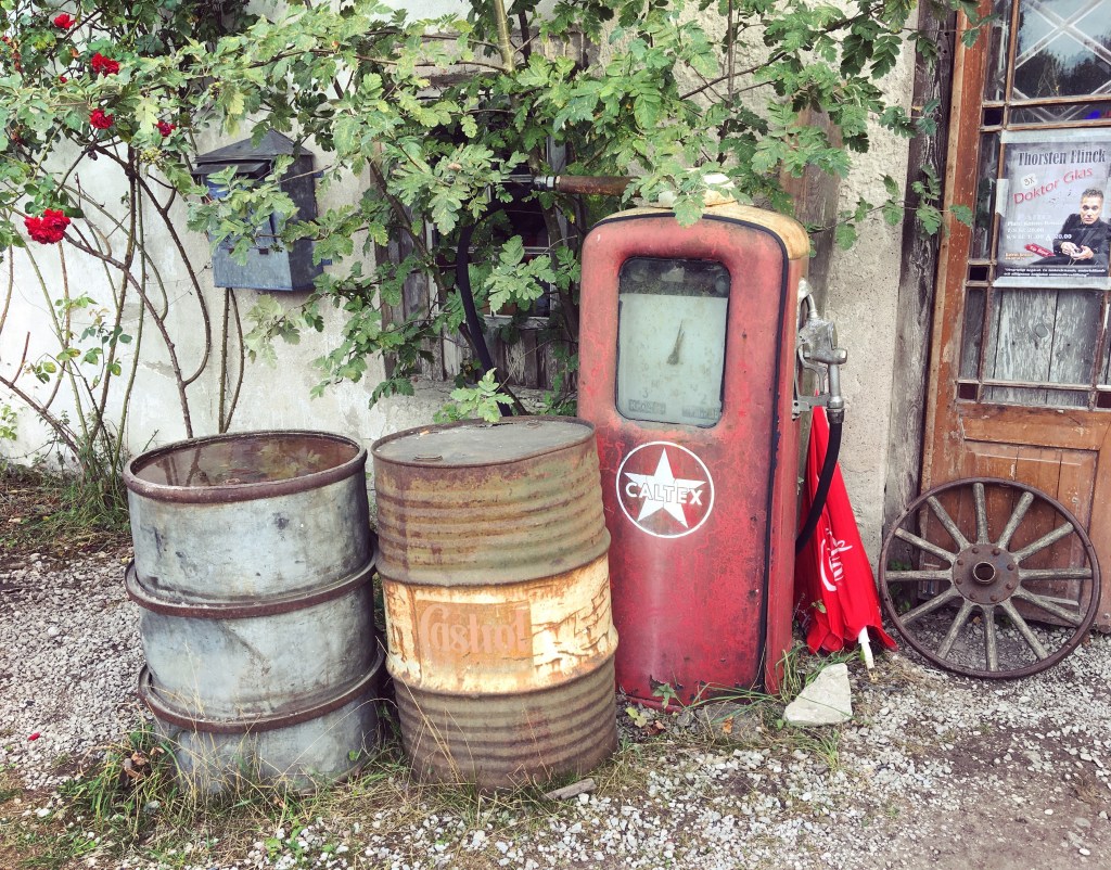 Här står gamla rostiga bilar, lika rostiga och gamla tunnor, bensinpumpar och allt möjligt skräp från en tid då bensin, olja och andra fossila bränslen andades en ljusnande framtid. Det är alltså pryttlar från mitten av det förra århundrat som vi pratar om.