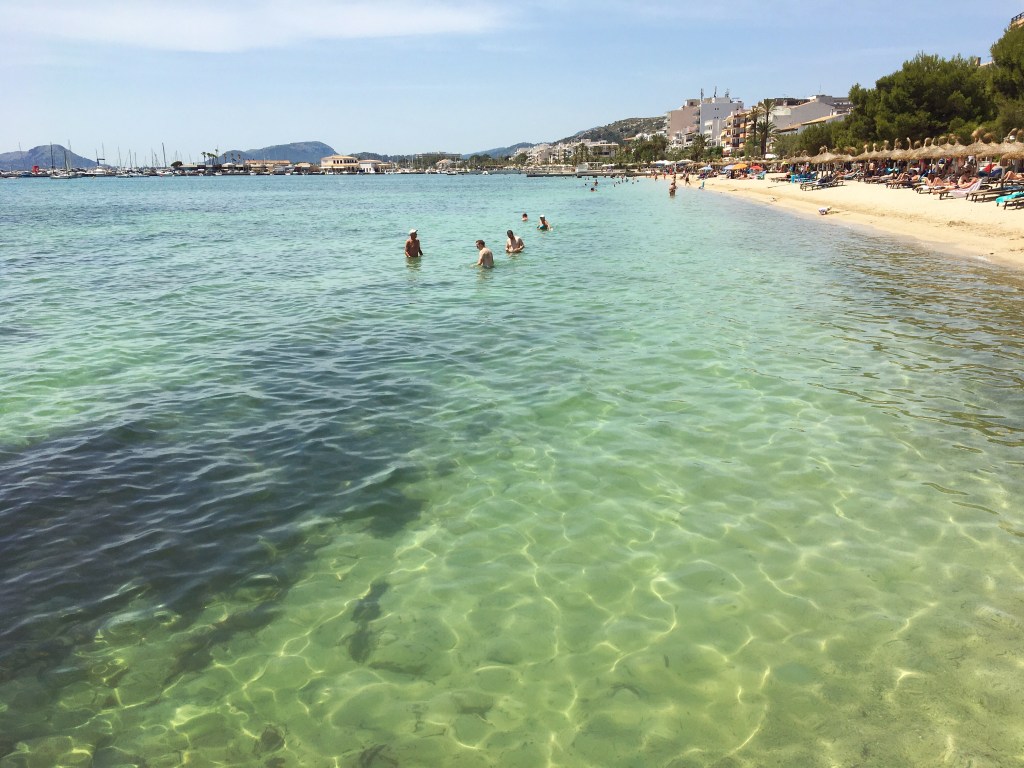 Jag ligger på solstolen i fråga. Den befinner sig i skuggan under ett parasoll på Platja del Port de Pollença. På stranden alltså. I en lagom stillsam liten badort på norra Mallorca.