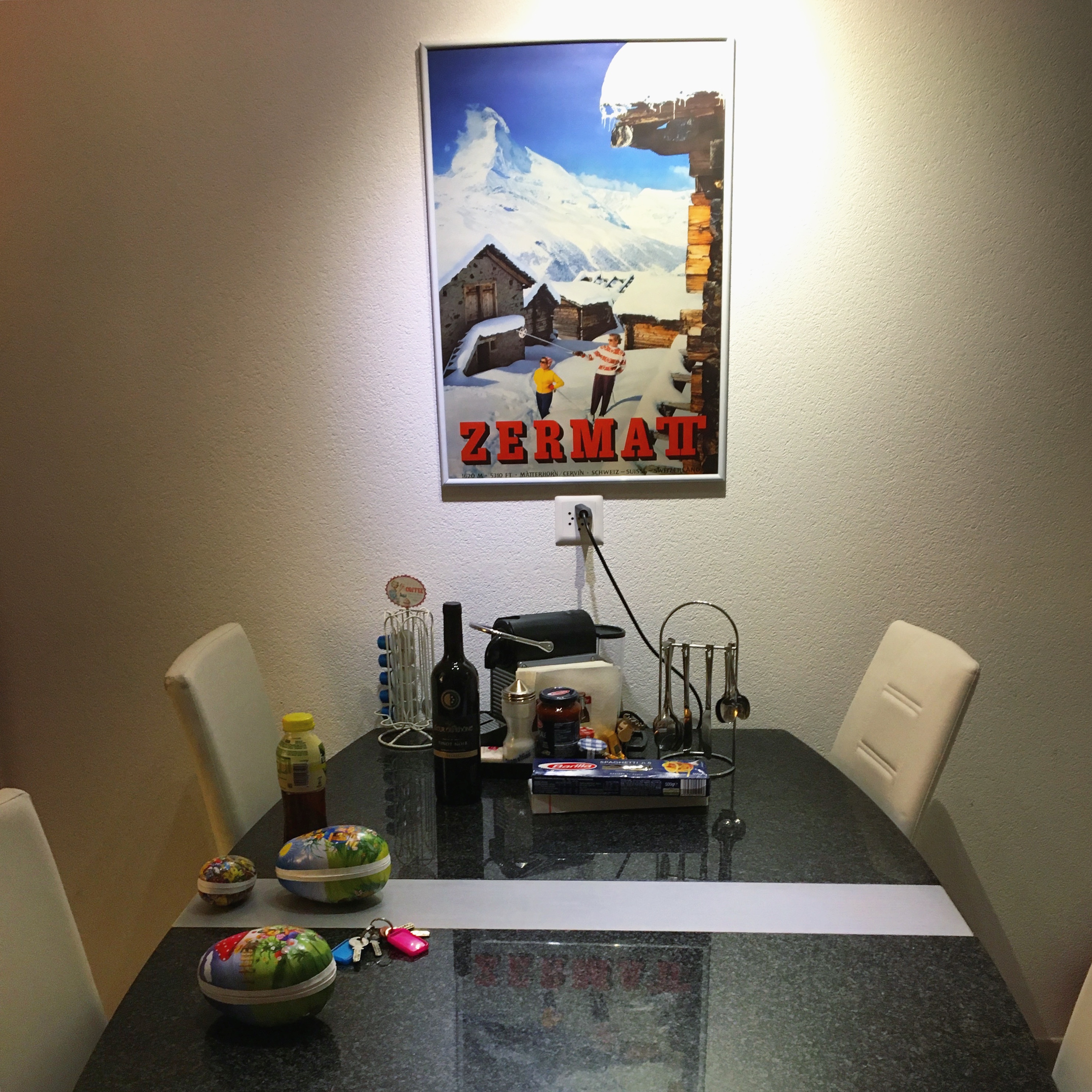 Matbordet i den lägenhet vi hyrde i Zermatt. Påskägg och iste hade vi med oss. Resten ingick.