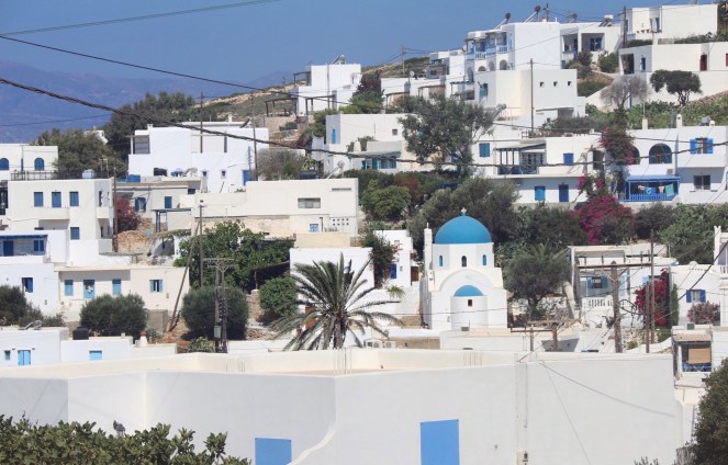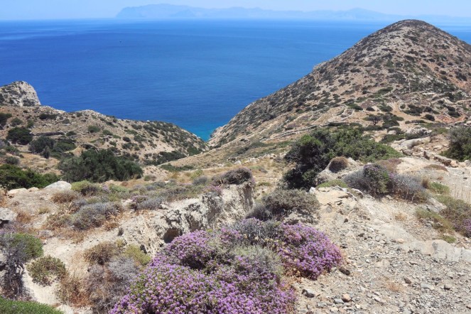 Därutöver kan du så klart vandra runt lite på ön. Landskapet är intagande. När vi var här tog vi det mest lugnt och gjorde endast en mindre vandring från en liten, liten by ner till en strand och tillbaka. Där var mycket vackert, men tyvärr visade sig stranden som vi sett ut, och som såg så fin ut uppifrån, vara en nudiststrand och med en ganska skräpig naturcamping dessutom. Det är den som syns på översta bilden i det här inlägget. Men vyerna på väg ner och upp var vackra. Sträckan vi gick var ungefär från kyrkan Ayia Sofia och till stranden Livadi.