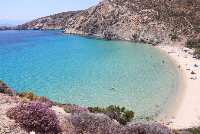 På ön finns utöver stranden i byn och den nudiststrand som vi av misstag råkade hamna på (och som syns på översta bilden i inlägget och som heter Livadi) bland annat stränderna Kedros och Kalotaritissa. Därutöver finns några mindre havsvikar där det också går att ta sig ner i vattnet. Samtliga stränder på ön är naturstränder utan uthyrning av solstolar och parasol, men på stranden Kedros finns en liten beach bar.
