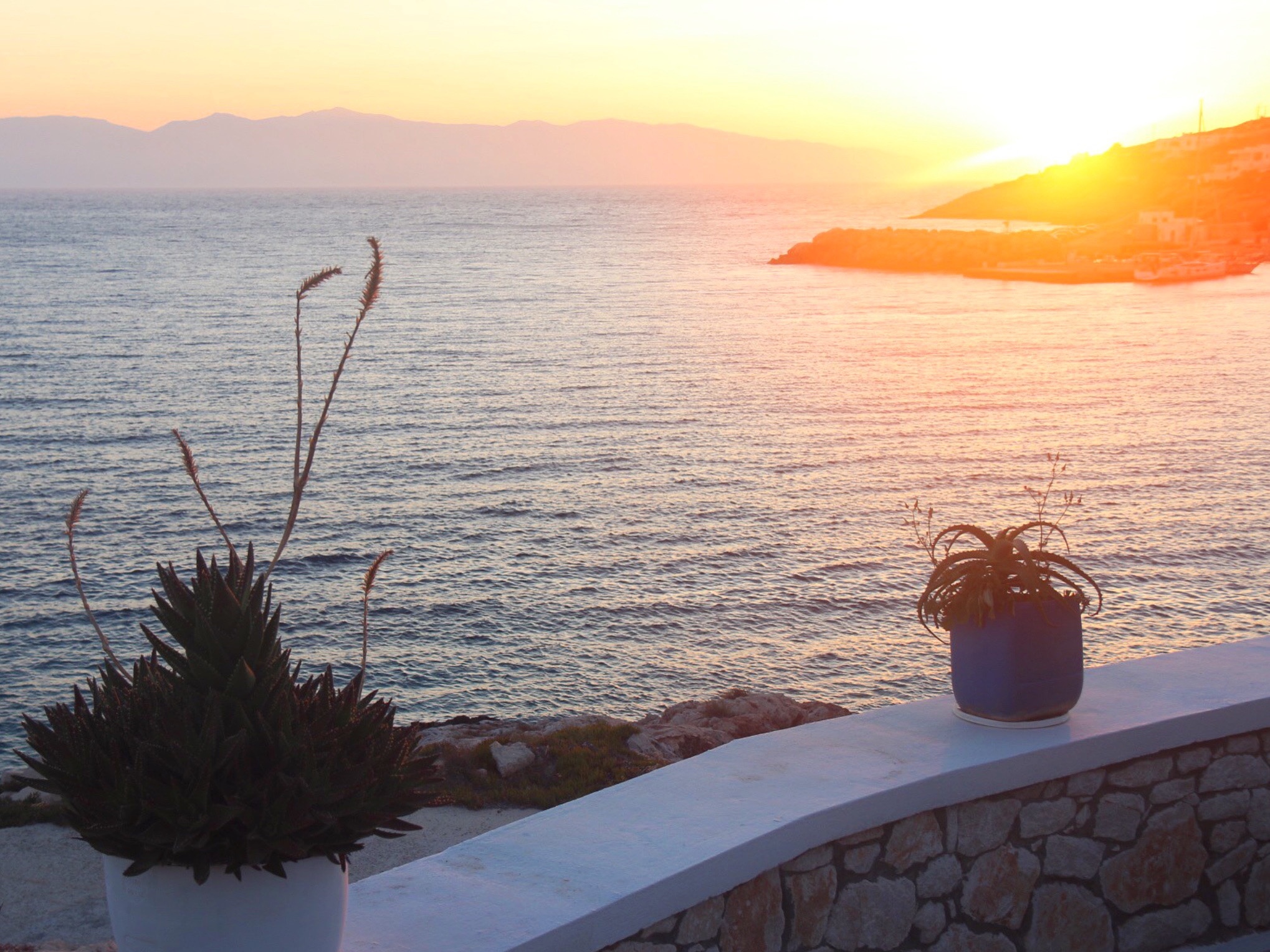 Annars ligger det några restauranger i samma by som där färjan lägger till. Vi åt ett par kvällar på Iliovasilema Restaurant och var mycket nöjda med maten där. Typiskt grekiska rätter som grekisk sallad och sedan grillat kött och fisk med pommes frites. Därifrån kunde vi också se solen gå ner på andra sidan vattnet, bakom en udde.