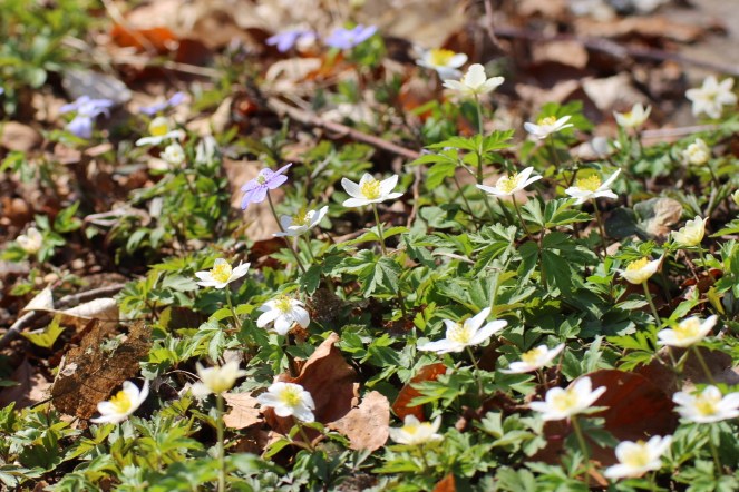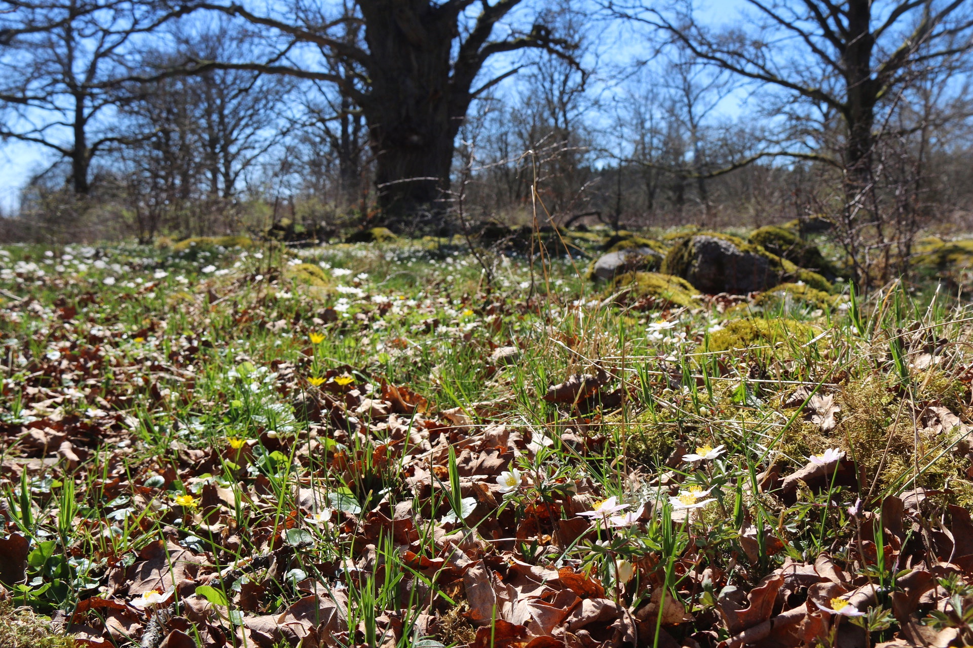 Bland ekar och björnbärssnår växer vitsippor och andra vårblommor.