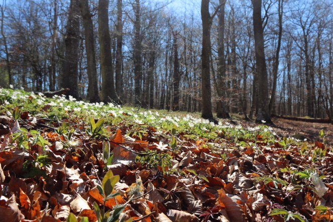 Bland bokskogens fjolårslöv har vitsipporna börjat titta fram.