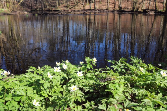 Vitsippor längs bilvägen genom Långasjöns friluftsområde.