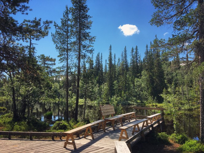 Eller så tar du med dig egen matsäck. I så fall finns det flera platser med bänkar runt Njupeskärsslingan där du kan sitta bekvämt och fika. Eller så sätter ni er på några stenar uppe på kalfjället. Helt enkelt är det dock inte att hitta stenar att sitta bekvämt på. Men visst finns det platser! Ta gärna med underlag att sitta på.