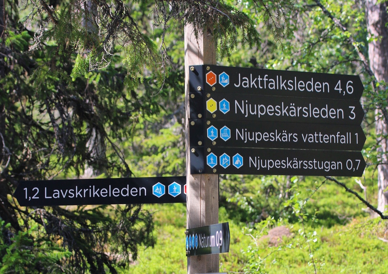 Jaktfalksleden, till exempel, som bara är fem och en halv kilometer och är en förlängd version av Njupeskärsleden rekommenderas endast för vana vandrare. Leden går nämligen uppför en brant som för många ska kännas mer som klättring än som vandring. Och även ovanför fallet är det sedan mycket krävande att vandra i den blockrika terrängen. Dessutom rekommenderas inte leden överhuvudtaget i regnigt väder, eftersom det då det blir väldigt halt.