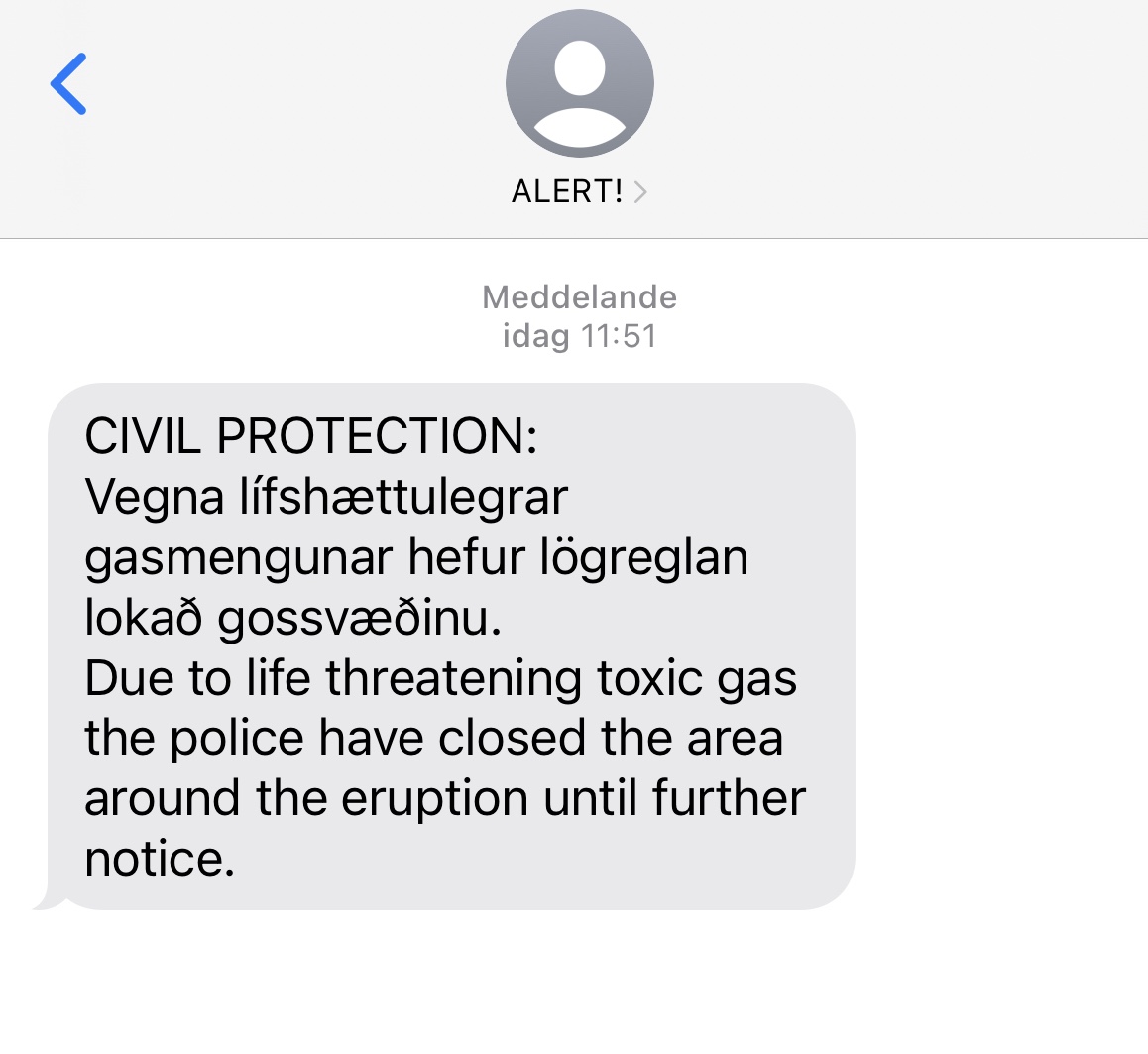 Från motorvägen på väg ut mot flygplatsen ser vi röken från vulkanen betydligt tydligare än vi gjorde kvällen innan från kyrktornet. I ett läge kommer röken från en plats precis bakom en äldre vulkan, vilket gör att det nästan ser ut som att röken kommer från den vulkanen. (Översta bilden.) Men i själva verket sker utbrottet på ett än så länge betydligt flackare område på en bergssluttning. Något som blir tydligt när vi lite längre fram kan köra av motorvägen för att parkera bilen en stund och ta oss en titt på vad vi bedömer som behörigt avstånd. Vi får dock alla ett var sitt SMS som meddelar på isländska och engelska att på grund av livsfarliga gaser så har polisen stängt av området runt utbrottet tills vidare.