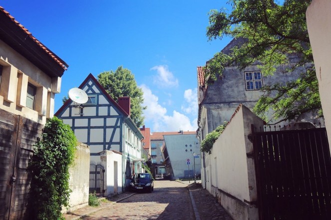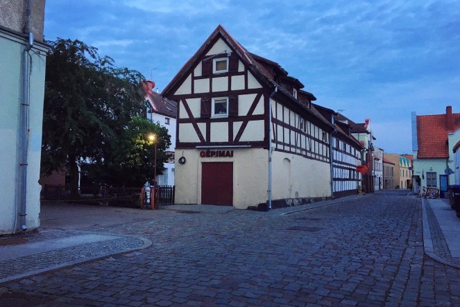 Här finns bland annat det stenlagda Teatertorget med en känd staty, försäljning av bärnsten (om den är äkta vet jag inte – men troligtvis inte) och annat samt flera mysiga restauranger. Turgaus gatvė heter en lite bredare gata som skär tvär igenom Gamla stan. Den har trädrader längs trottoarerna och vackra, lite högre och lite ståtligare stenhus med putsade fasader. Tre våningar snarare än två. Eller ta sikte på baren 10 TILTŲ Kiemas för att hitta till ett mysigt kulturkvarter med fina korsvirkeshus mellan gatorna Daržų gatvė och Bažnyčių gatvė.