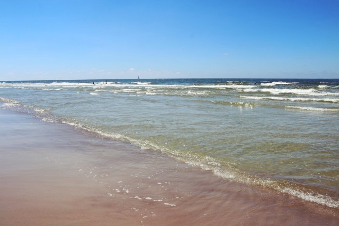 Stranden ligger längst i väster, ut mot Östersjön. Den är bred och lång och eftersom Östersjön domineras av västliga vindar är badtemperaturerna inte sällan bättre här än på den svenska sidan. Pålandsvind, du vet.