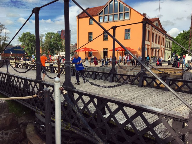 Nära hotellet Old Mill där en gata vid namn Žvejų gatvė korsar en kortare vattenväg, mellan floden Danė och småbåtshamnen i vallgraven vid den gamla slottsruinen, finns en spännande svängbro. När du går längs den södra sidan av floden ner mot havet går du över bron för att komma vidare ner mot kryssningsterminalen. Den så kallade ”Kedjebron” byggdes 1855 och fungerar än idag. När bron vänds 90 grader kan båtar och yachter gå in i slottets hamn.