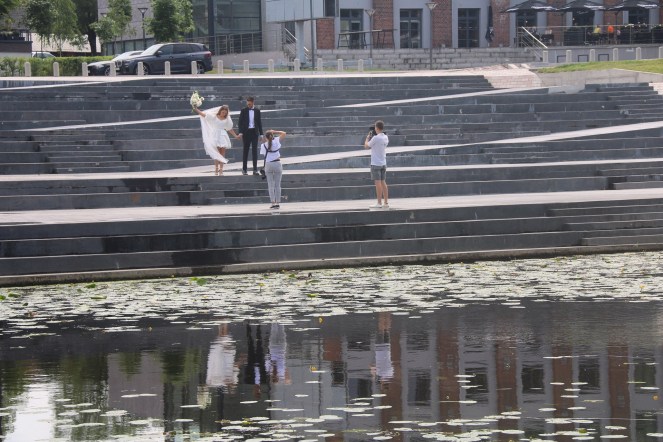 På andra sidan av floden Danė ser du en bronsflicka som står på tå. Hon skickar en kyss till skulpturen av pojken med mössan. Skulpturen kallas därför ”Kiss”.