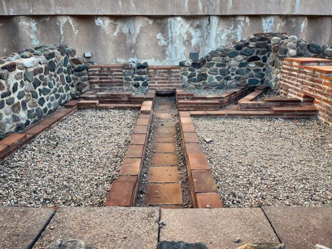 I det här området finns också bland annat rester av vattenledningar av bly och här visas också kanaler för golvvärme i ett hus. Om jag förstod skyltarna rätt så var det ånga från de heta källorna som transporterades i kanalerna och värmde husen på vintern.