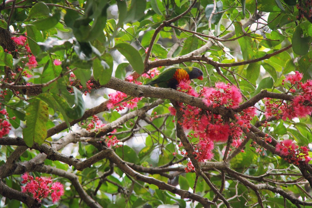 Och lika intressanta som alla fina växter är de vilda djur som rör sig i parken. Australisk ibis är en fågel som är släkt med det gamla Egyptens heliga ibisar och som har ett speciellt utseende med vit kropp och svart, bart huvud med en lång böjd näbb. Regnbågslorikit är en mycket färgglad papegojfågel. Och flygande hundar, flying foxes, är jättelika fladdermöss som hänger upp och ner i träden. För att bara nämna några.