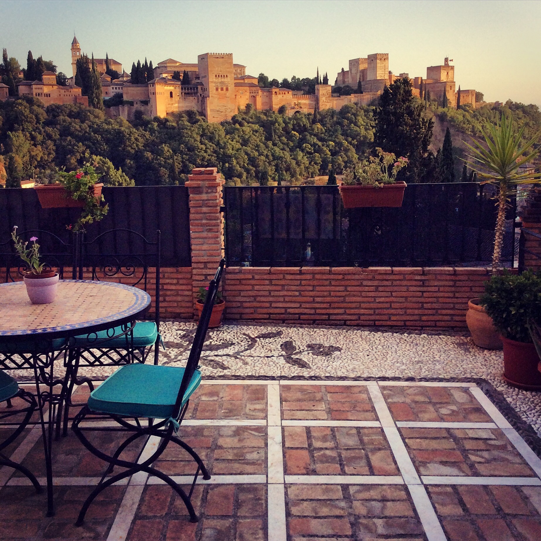 Vi bodde i en modernt inredd lägenhet med moriska utsmyckningar i en grotta. Temperaturen var behaglig. Och från vår terass och från takpoolen hade vi utsikt över Alhambra, bergen och ner över staden. Alhambra är ett imponerande palats, som byggdes av morerna på 1200-talet, med vackra trädgårdar och intrikata arkitektoniska detaljer. Det bör alltså ses även på nära håll. Men se då till att skaffa biljetter i god tid. Och vill du sedan se palatset även från ditt boende är det här hotellet ett mycket bra val.
