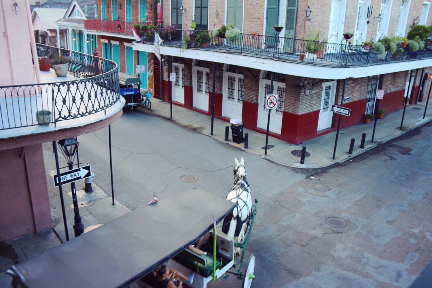 I de här delarna är de franska kvarteren mycket lugna. Vårt hotellrum för fyra låg på andra våningen. Det var mycket häftigt luftkonditionerat. För den som istället ville ha värme fanns det en veranda att sitta på utanför rummet. Den löper runt hela andra våningen på hotellet. Så som verandorna ser ut i de ”franska” kvarteren som egentligen inte är så franska, utan mer spanska. Men i alla fall. Räcke, stolar och bord av smidesjärn.