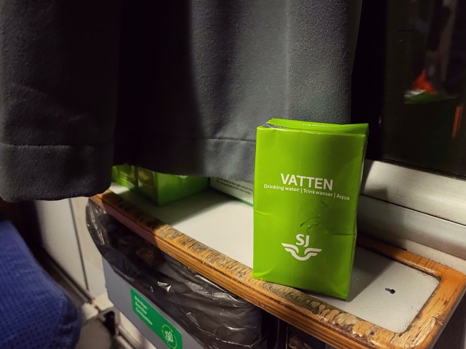 22:53 ska det gå ett tåg mot Köpenhamn som ska vara framme 01:00. Tåget avgår i verkligheten kvart över elva. Uppsidan är att detta beror på att de hängt på ytterligare ett vagn-set och att alla nu får sitta. Konduktörerna delar också ut små vattenflaskor till alla. Vi får välja med eller utan brus. 01:25 är vi inne på København H.